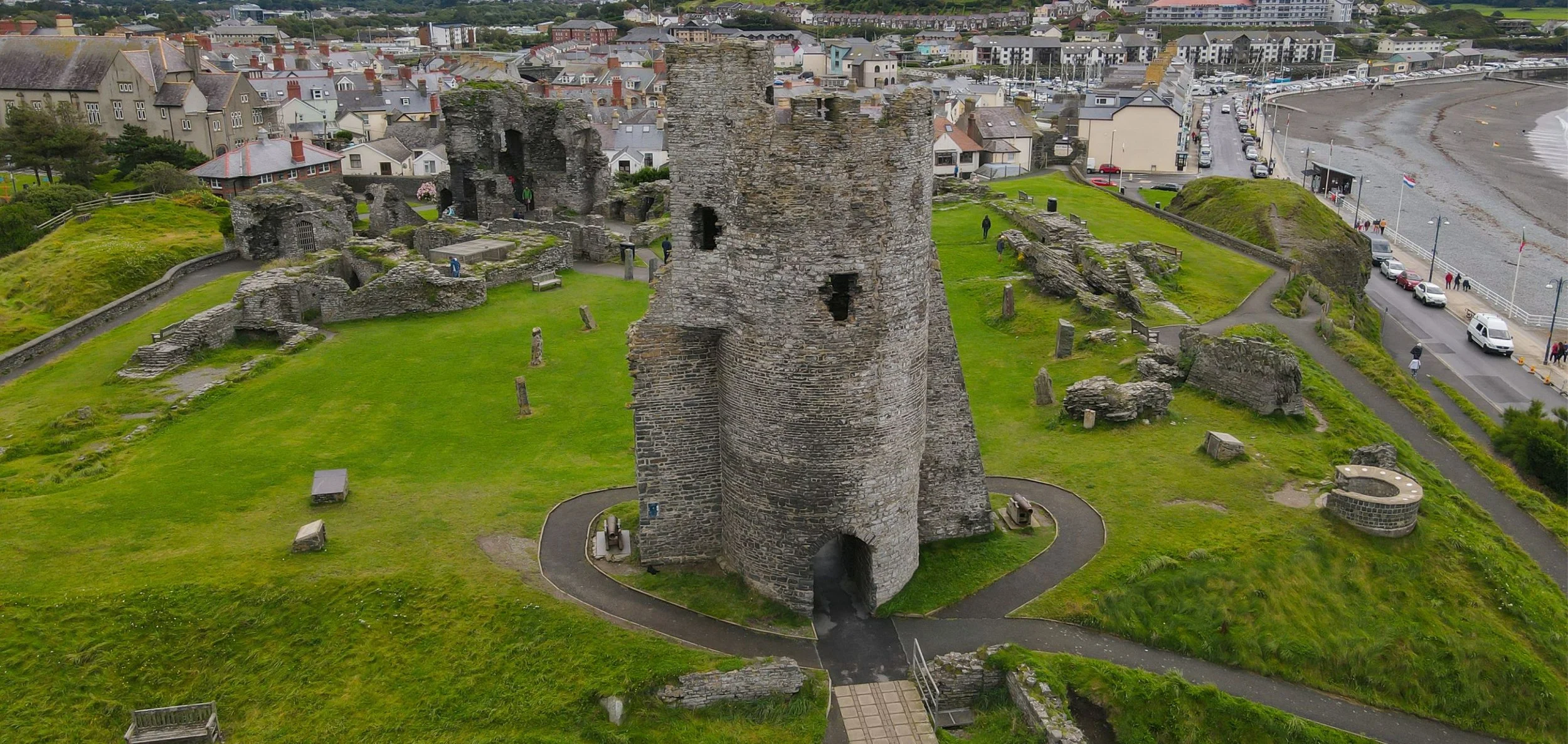 Benches are nearby, and parts of the castle grounds are maintained as public parkland by Aberystwyth Town Council.